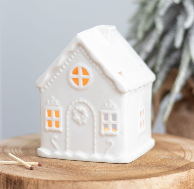 Un precioso candelabro para velas pequeñas con forma de casita de jengibre blanca. Perfecto para crear un ambiente festivo en Navidad con la suave luz de las velas filtrándose por las ventanitas.